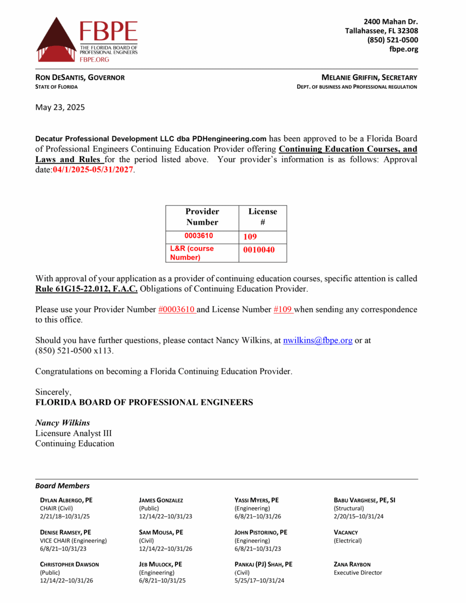 PDHengineer is approved by the Florida Board of Professional Engineers as a provider of continuing education for professional engineers. We are Florida Approved Continuing Education Provider #0003610, listed on the Florida Board’s site as Decatur Professional Development, LLC dba PDHengineer.com. In addition to Area of Practice courses, we are also approved to offer Florida Laws and Rules.